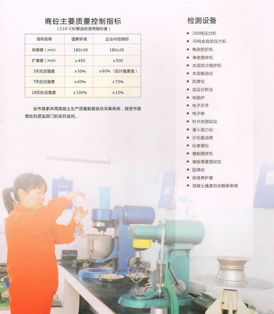 公司設有先進的實驗室,配備全套混凝土及原材料檢測試驗設備,配有專職的試驗、檢驗人員,可承擔混凝土的材料性能試驗,工藝質量控制、產(chǎn)品質量檢驗等全部試驗、檢驗項目,為確;炷临|量提供了可靠的保證。